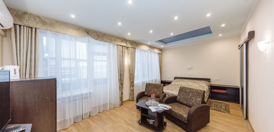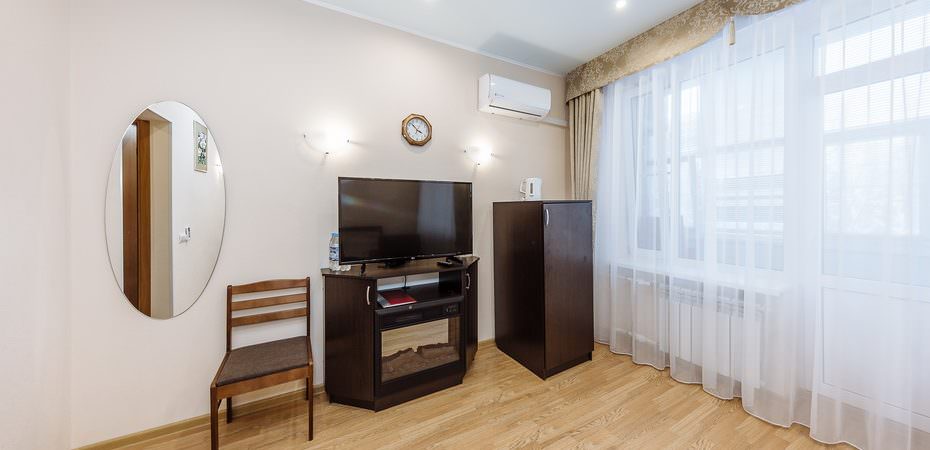 Площадь номера - 19 кв.м. 2 осн. места. 1 доп. место. Балкон. Мебель: вешалка, зеркало, кресло-кровать, кровать двуспальная, прикроватные тумбочки, столик журнальный, стулья, шкаф. Оборудование: гладильная доска, камин (электрокамин), кондиционер, сейф, стиральная машина, телевизор, утюг, холодильник, чайный набор посуды, электрочайник. Санузел: с душем, туалетные принадлежности, фен. Сервис: смена полотенец, смена постельного белья, уборка номера.