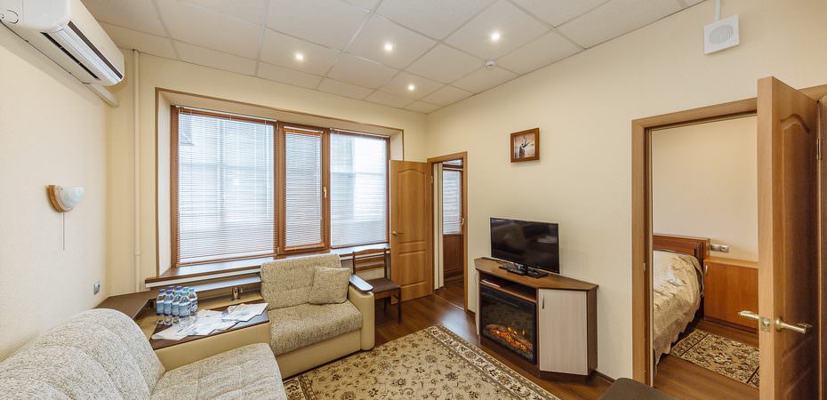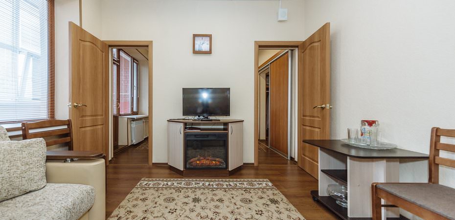 Площадь номера - 23 кв.м. 2 осн. места. 2 доп. места. Балкон. Мебель: вешалка, диван раскладной, зеркало, кресло, кровать двуспальная, прикроватные тумбочки, столик кофейный, стул, шкаф. Оборудование: гладильная доска, камин (электрокамин), кондиционер, сейф, стиральная машина, телевизор ЖК, утюг, чайный набор посуды, электрочайник. Санузел: с джакузи (или ванной), туалетные принадлежности, фен. Сервис: смена полотенец, смена постельного белья, уборка номера.