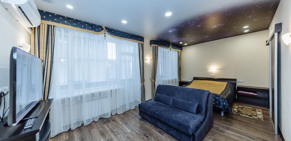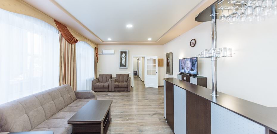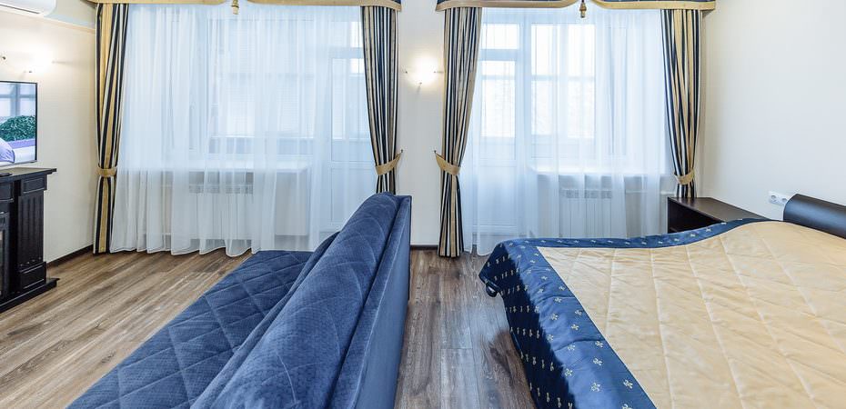 2 осн. места. 1 доп. место. Мебель: вешалка, зеркало, кровать двуспальная, набор мягкой мебели, прикроватные тумбочки, стол, стулья, шкаф. Оборудование: гладильная доска, микроволновая печь, мини-холодильник, сейф, стиральная машина, телевизор, утюг, чайный набор посуды, электрочайник. Санузел: с ванной или душевой кабиной, туалетные принадлежности, фен. Сервис: смена полотенец, смена постельного белья, уборка номера.