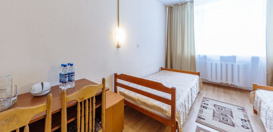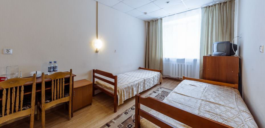 Площадь номера - 11,5 кв.м. 2 осн. места. 1 доп. место. Мебель: вешалка, зеркало, кровати односпальные, прикроватные тумбочки, стол, стулья, шкаф. Оборудование: мини-холодильник, телевизор, холодильник. Санузел: с ванной, туалетные принадлежности, фен. Сервис: смена полотенец, смена постельного белья, уборка номера.