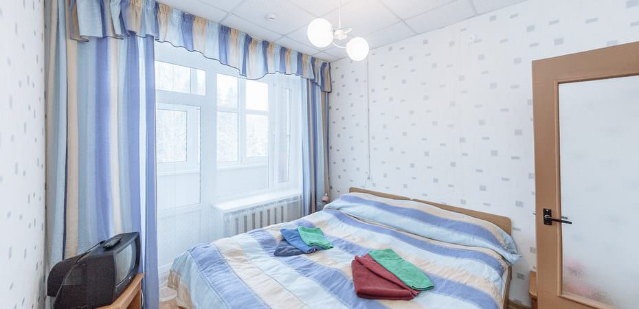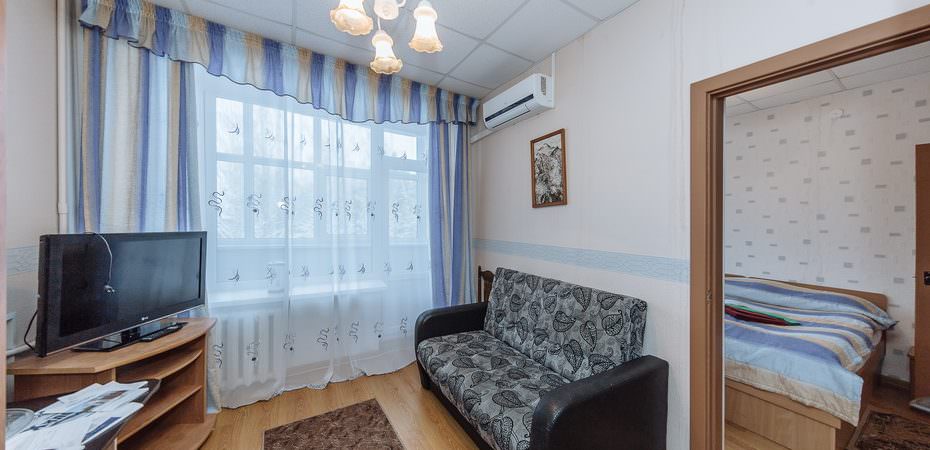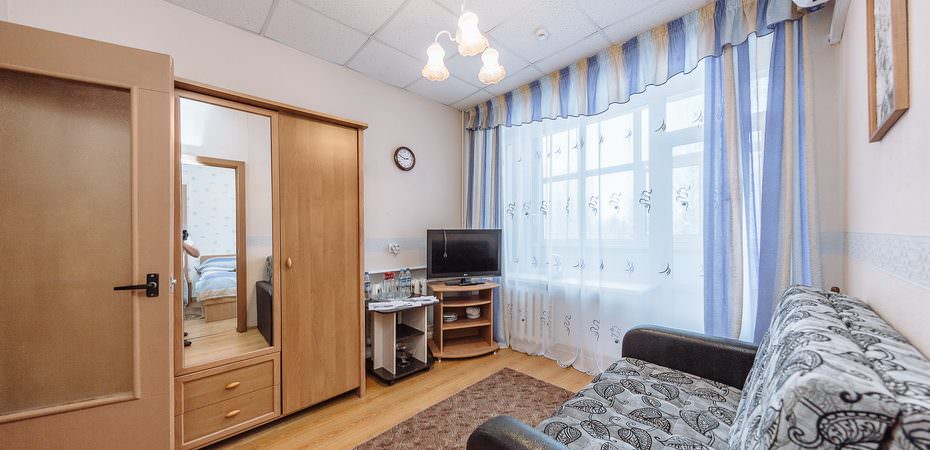 Площадь номера - 24,9 кв.м. 2 осн. места. 1 доп. место. Мебель: вешалка, диван раскладной, кровать двуспальная, прикроватные тумбочки, стол, стул, шкаф. Оборудование: гладильная доска, мини-холодильник, сейф, телевизор, утюг, чайный набор посуды, электрочайник. Санузел: с ванной или душевой кабиной, туалетные принадлежности, фен. Сервис: смена полотенец, смена постельного белья, уборка номера.